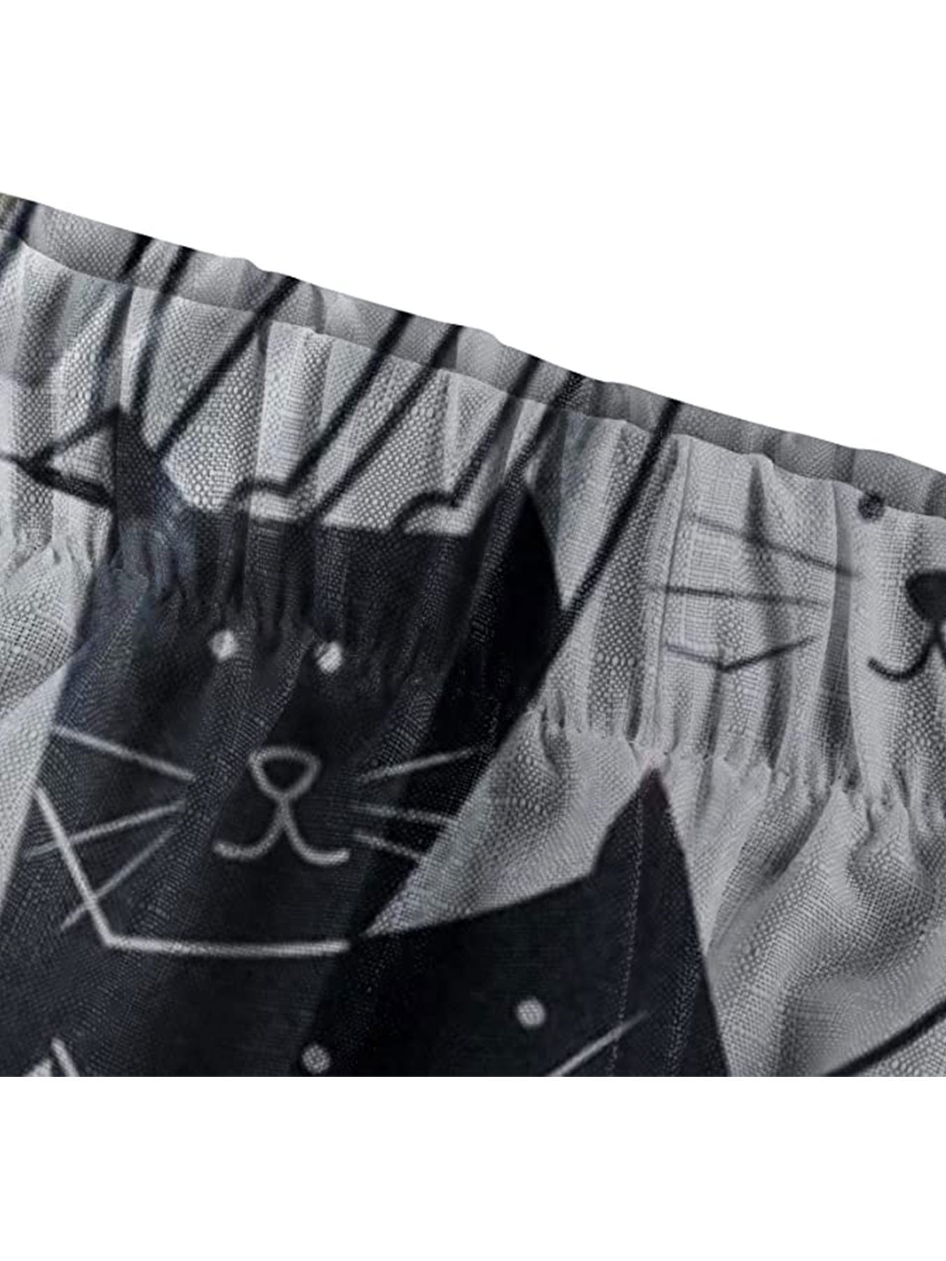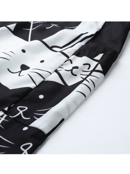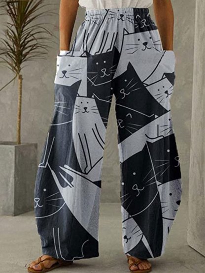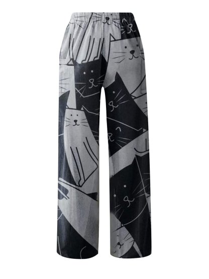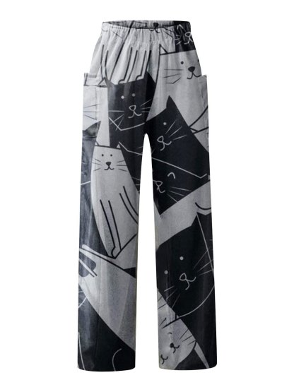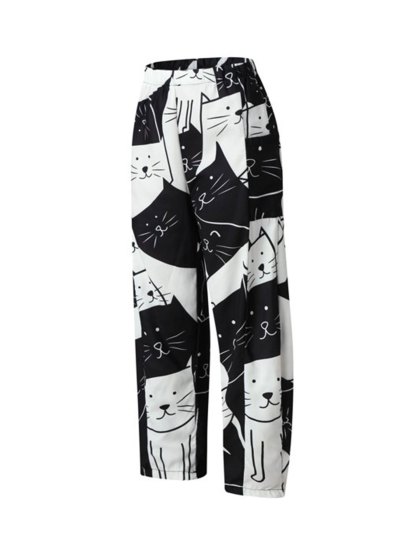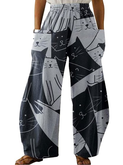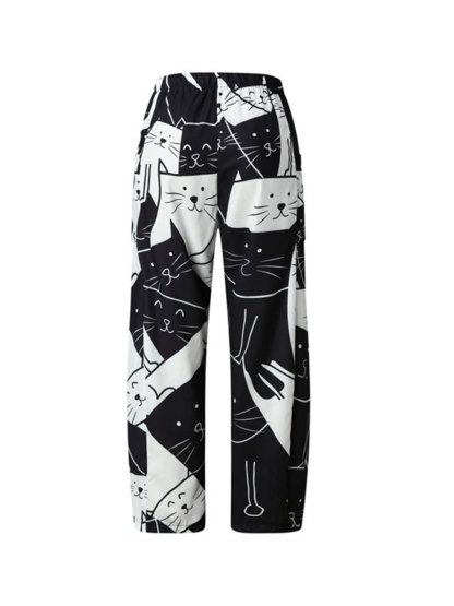 Women's Pants Mid Waist Cat Print Pocket Long Length Pants