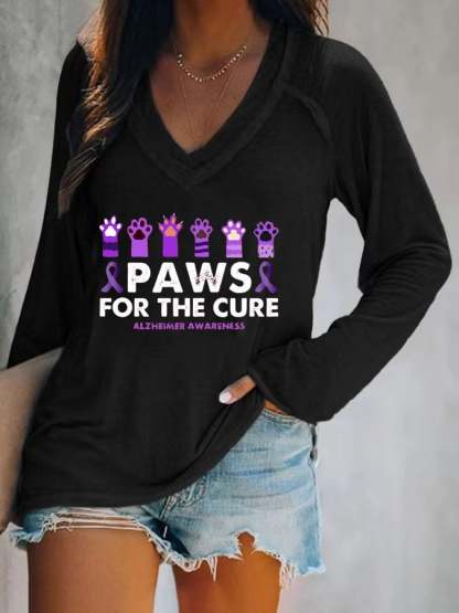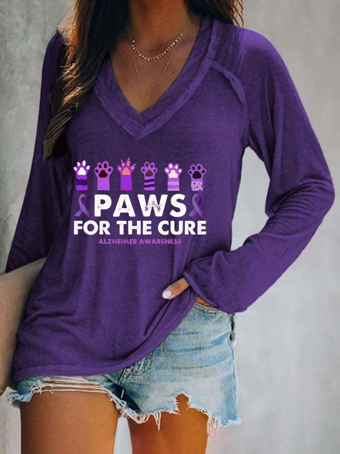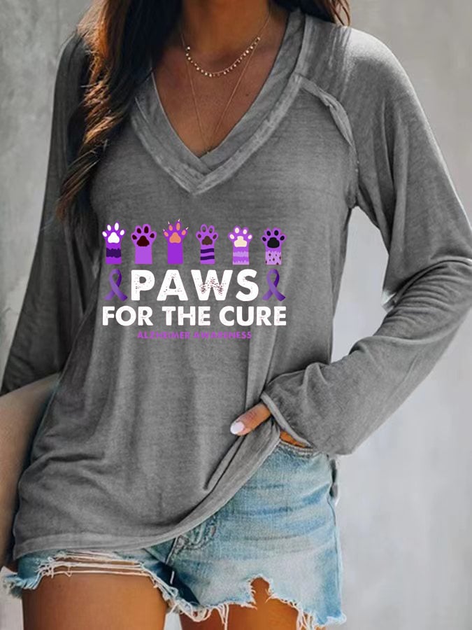 Women's Paws For The Cure Alzheimer Awareness Printed V-Neck T-Shirt