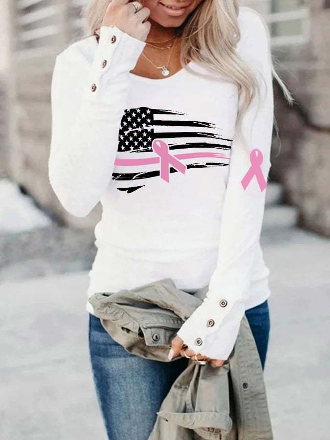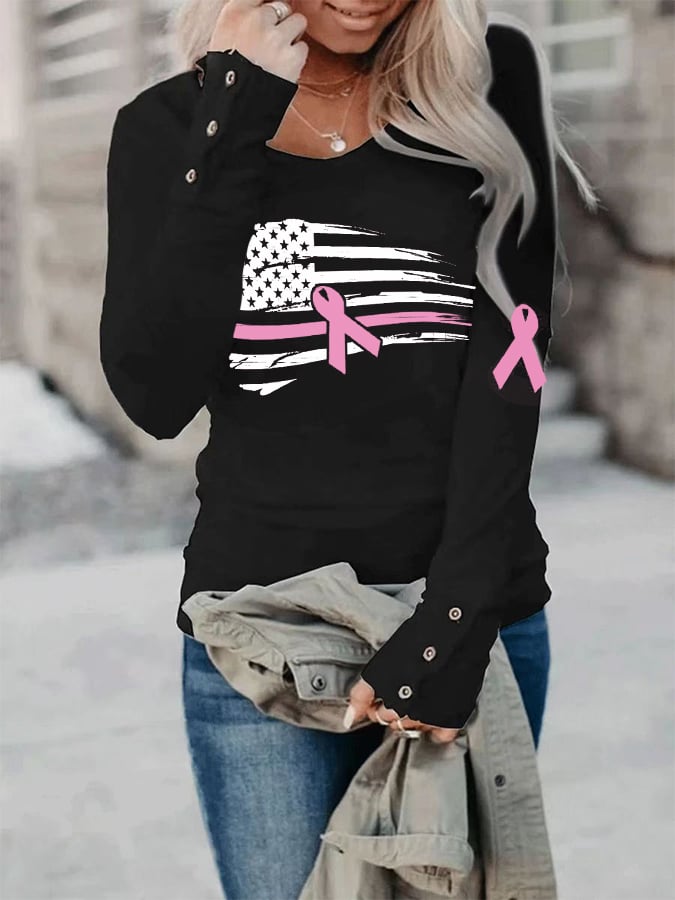 Women's Pink Ribbon Breast Cancer Awareness Warrior American Flag Print Top