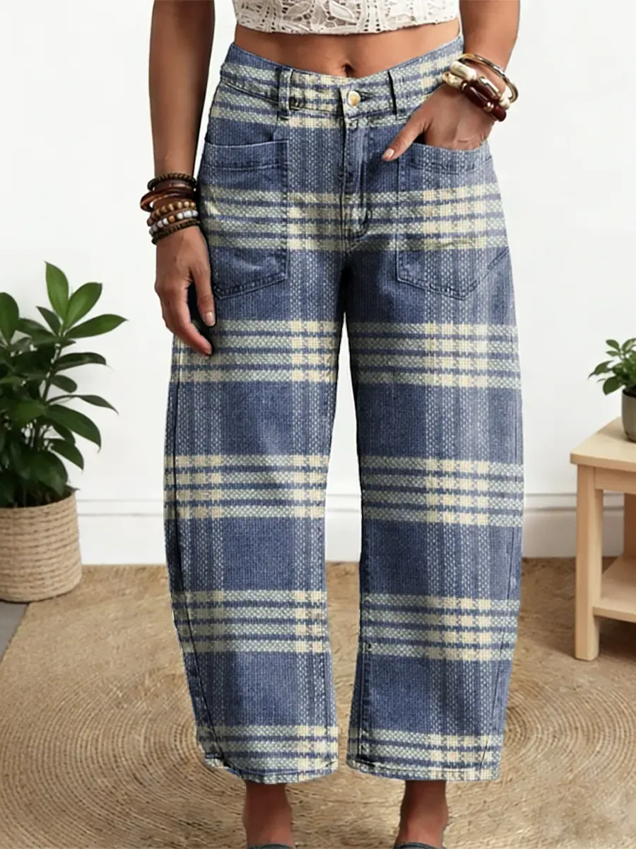 Women's Plaid Pattern Art Print Casual Cotton Denim Pants