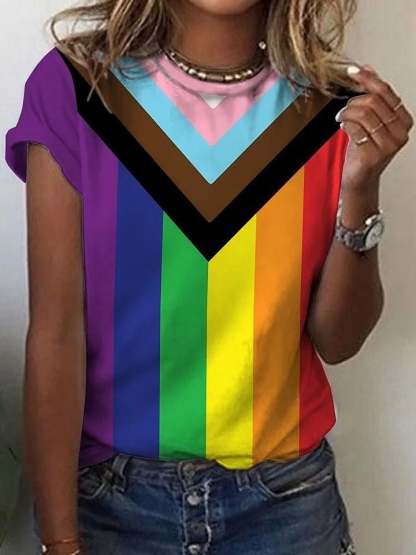 Women's Pride Month Rainbow Stripe Print Crew Neck T-Shirt Top