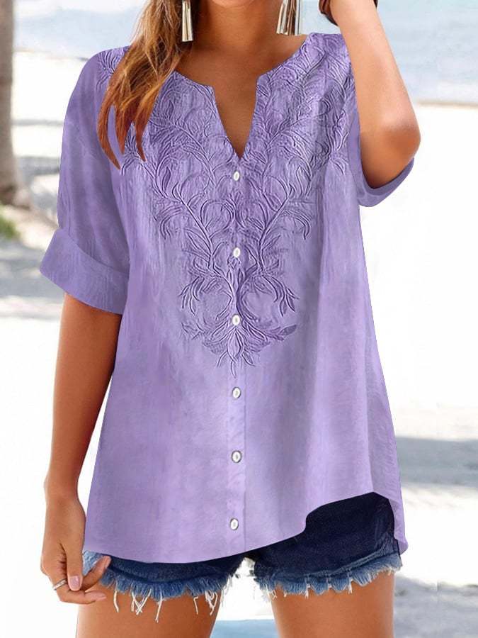 Women's Purple Art Design Printed Button Design V-Neck Casual Shirt
