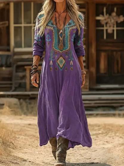 Women's Purple Floral Cotton Linen Loose Dress