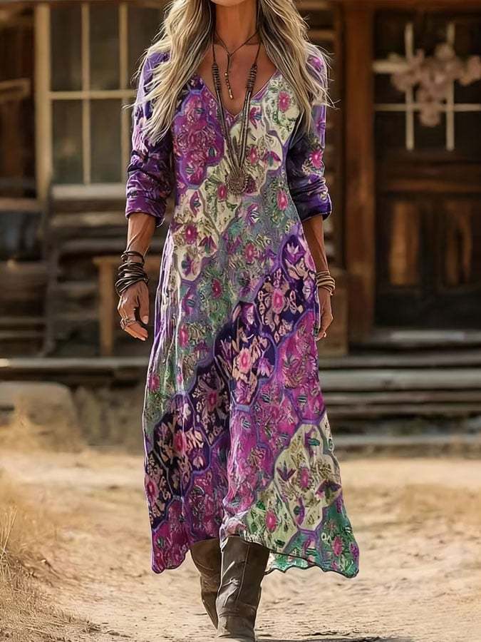 Women's Purple Floral Cotton Linen Loose Dress
