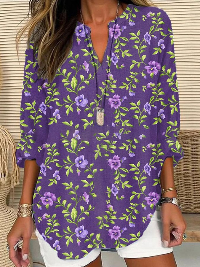 Women's Purple Floral Print Casual Long Sleeve V-Neck Shirt