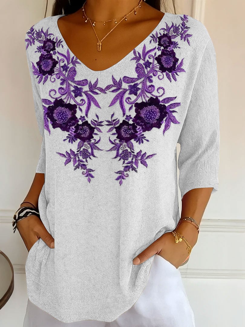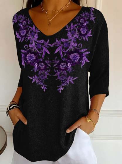 Women's Purple Flower Unconditional Love Embroidery Print Shirt