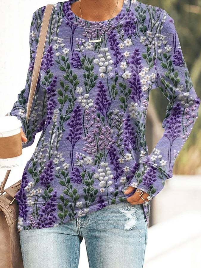 Women'S Purple Lavender Embroidery Print Long Sleeve Sweatshirt