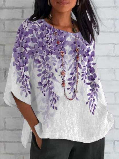 Women's Purple Plant Print Round Neck Loose Shirt