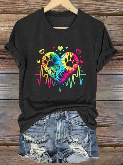 Women's Rainbow Color ECG Cute Dog Paw Print Round Neck Print T-Shirt Top