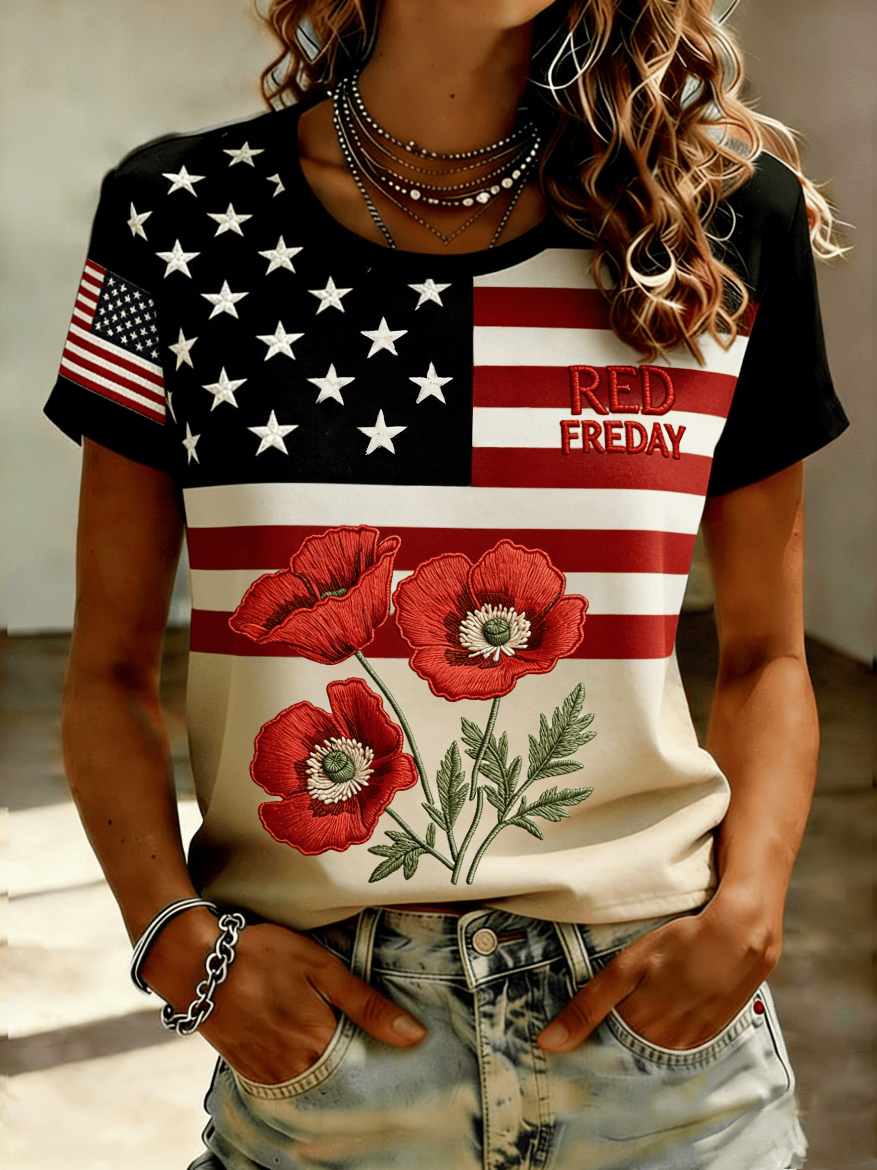 Women's Red Friday Poppy Print Casual Crew Neck Short Sleeve T-Shirt