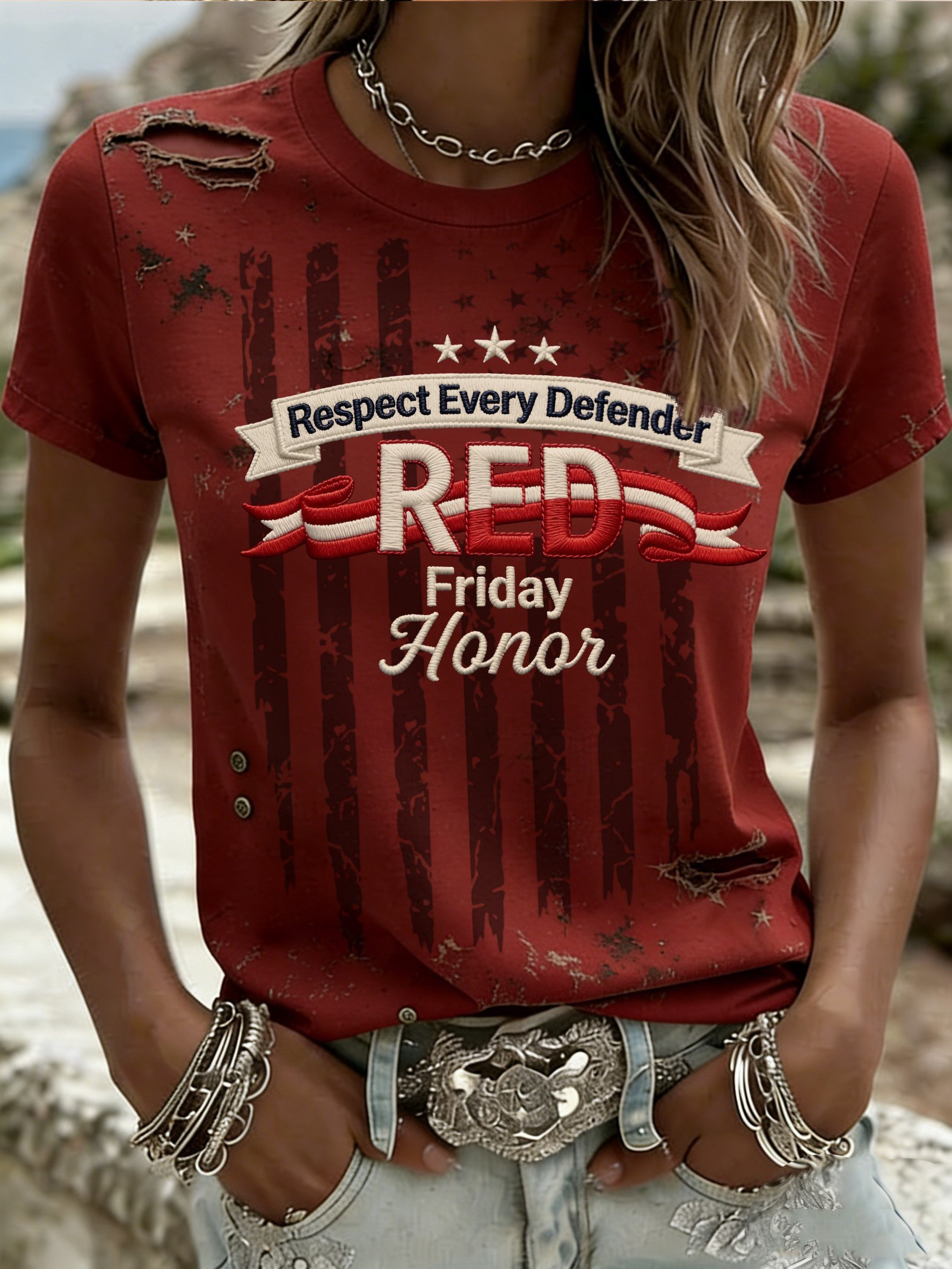 Women's Red Friday Print Casual Crew Neck Top