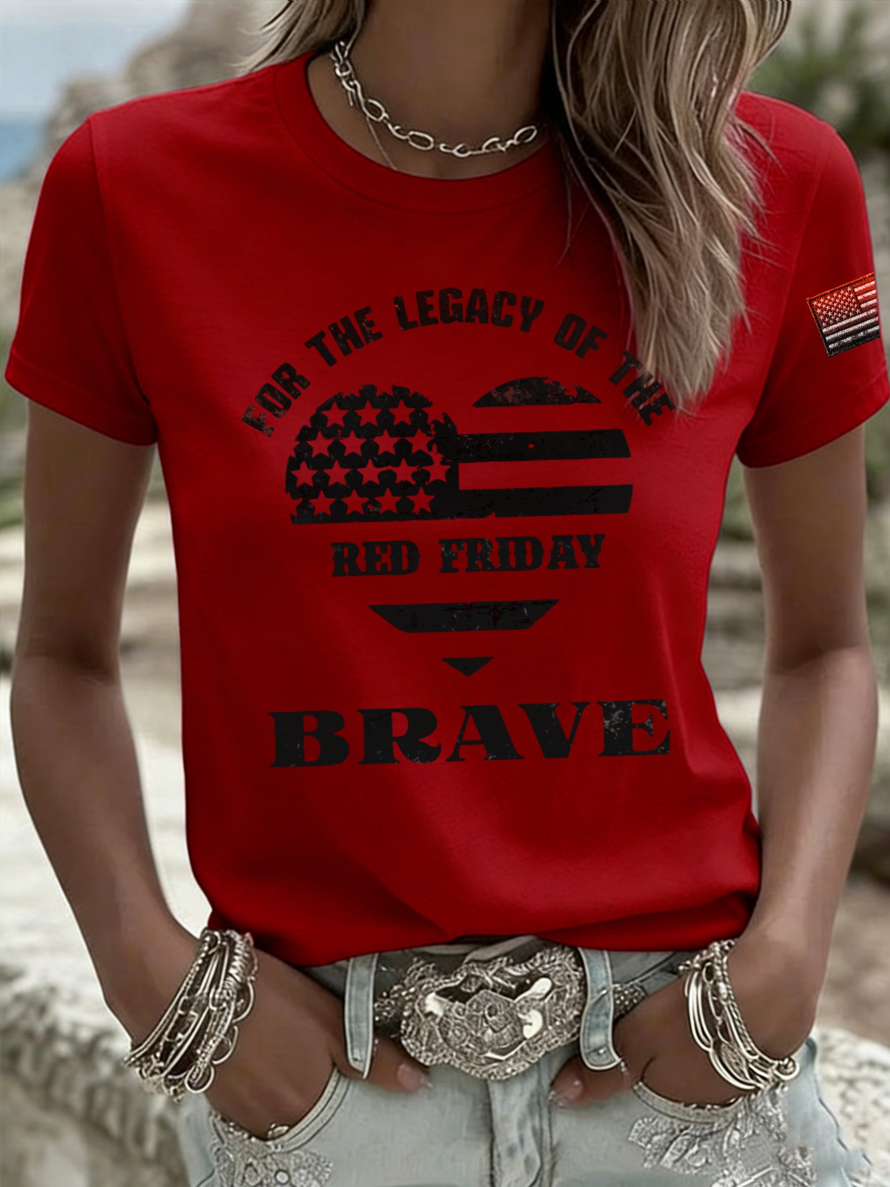 Women's Red Friday Print Casual Crew Neck Top