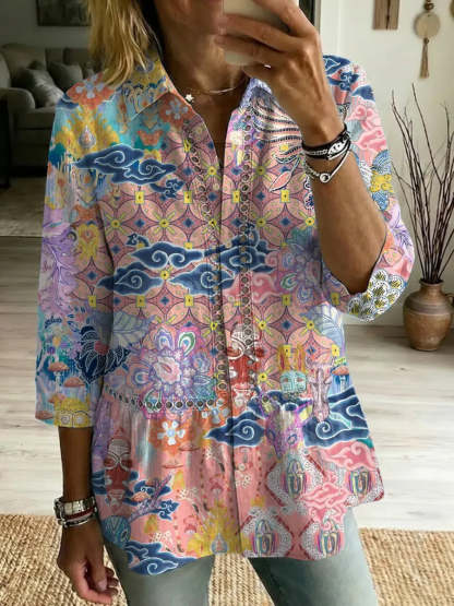 Women's Retro Art Print Casual Lapel Cotton Shirt