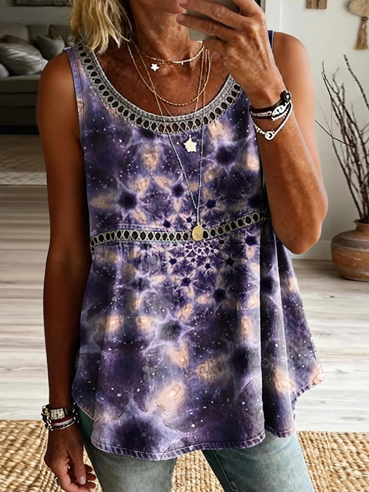 Women's Retro Art Print Casual Sleeveless Hollow-out Cotton Linen Vest