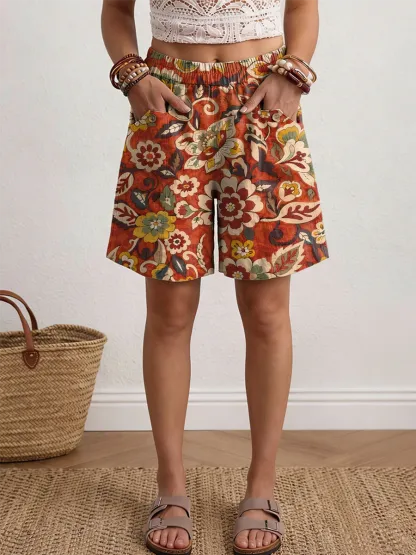 Women's Retro Bohemian Floral Art Print Casual Cotton Linen Shorts