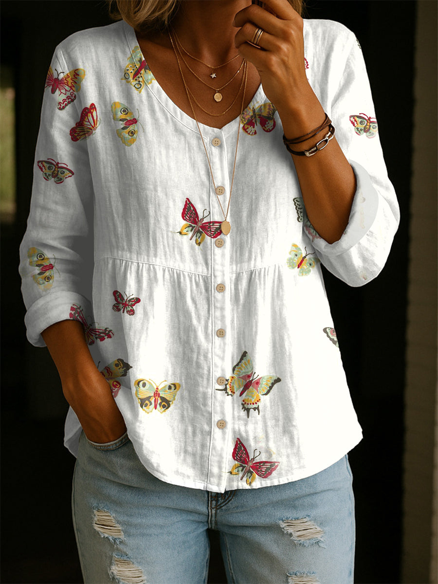 Women's Retro Butterfly Art Print Linen Cotton Shirt
