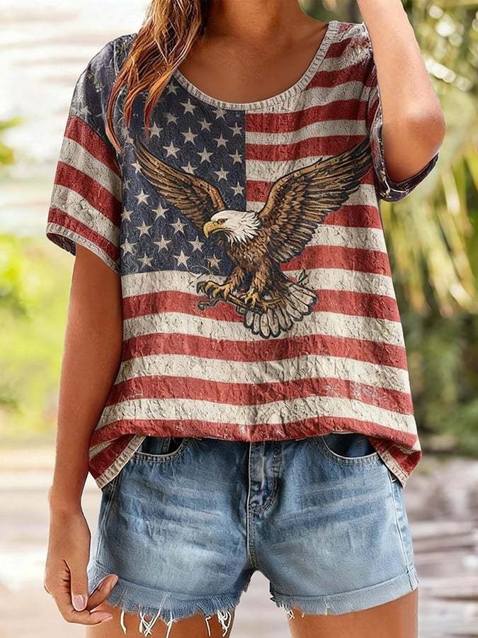 Women's Retro Cotton-Linen T-Shirt: American Flag & Bald Eagle Design