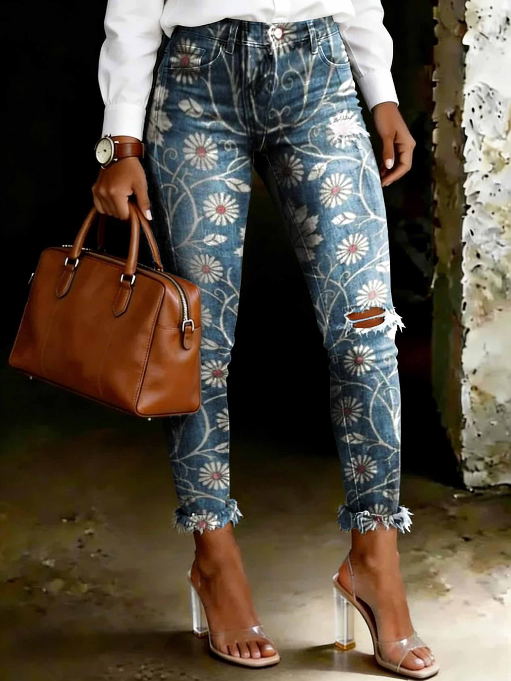 Women's Retro Daisy Art Print Ripped Skinny Jeans
