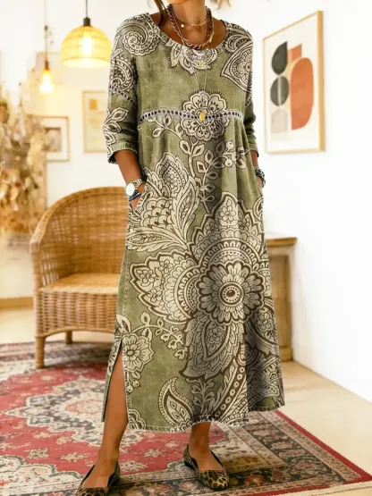 Women's Retro Ethnic Floral Texture Art Print Cotton Denim Dress With Lace Trim