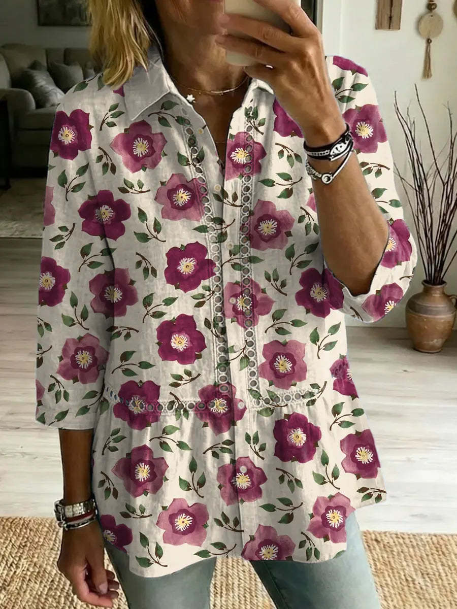 Women's Retro Floral Art Print Casual Lapel Cotton Shirt – lolonb
