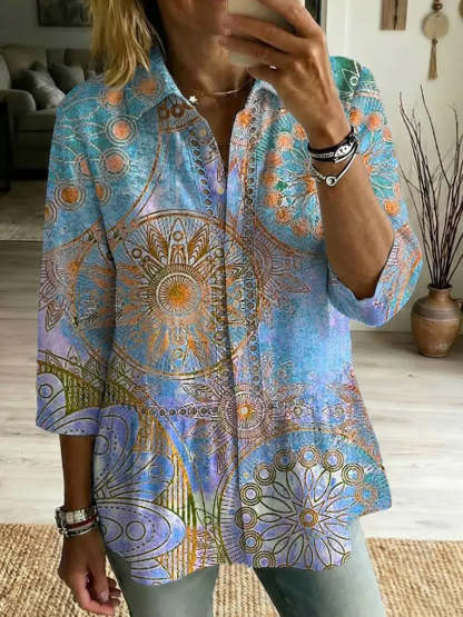 Women's Retro Floral Art Print Casual Lapel Cotton Shirt – lolonb