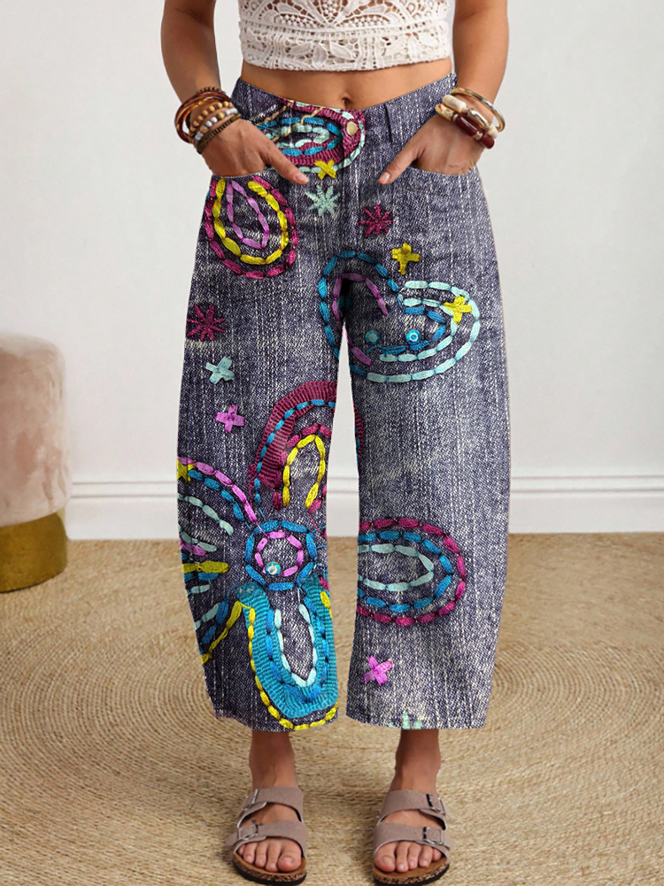 Women's Retro Floral Art Print Casual Washed Cotton Jeans