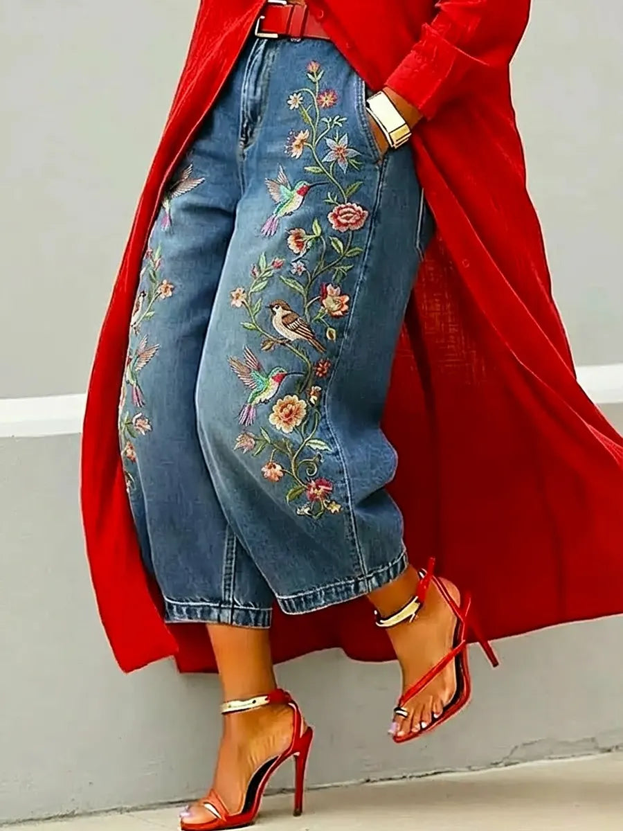 Women's Retro Floral Birds Pattern Art Print Casual Jeans – lolonb