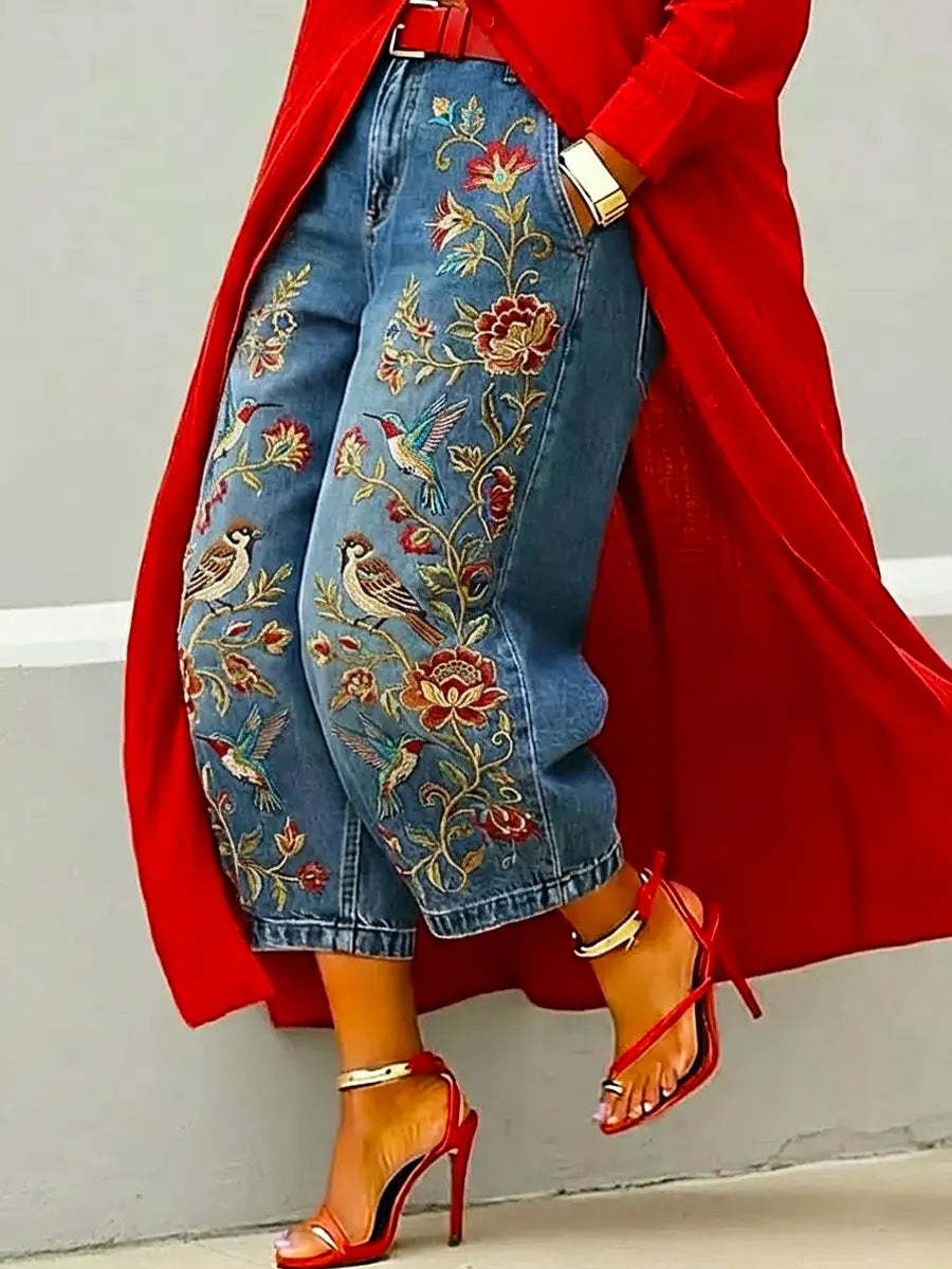 Women's Retro Floral Birds Pattern Art Print Casual Jeans