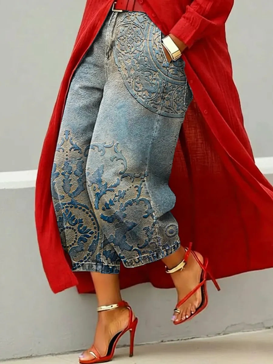 Women's Retro Floral Pattern Art Print Casual Jeans