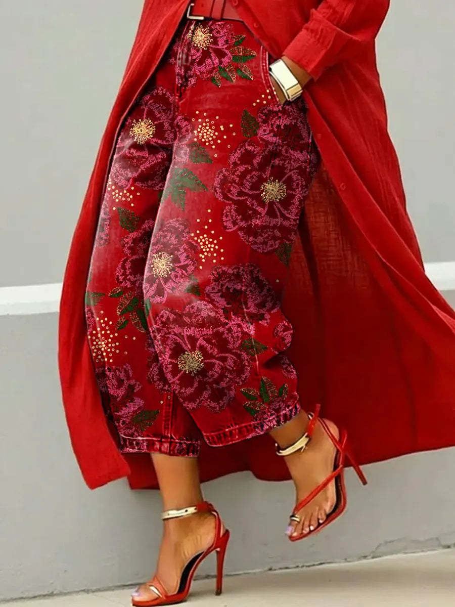 Women's Retro Floral Pattern Art Print Casual Jeans
