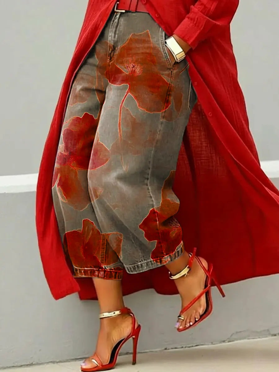 Women's Retro Floral Pattern Art Print Casual Jeans – lolonb