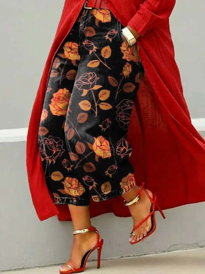 Women's Retro Floral Pattern Art Print Casual Jeans – lolonb