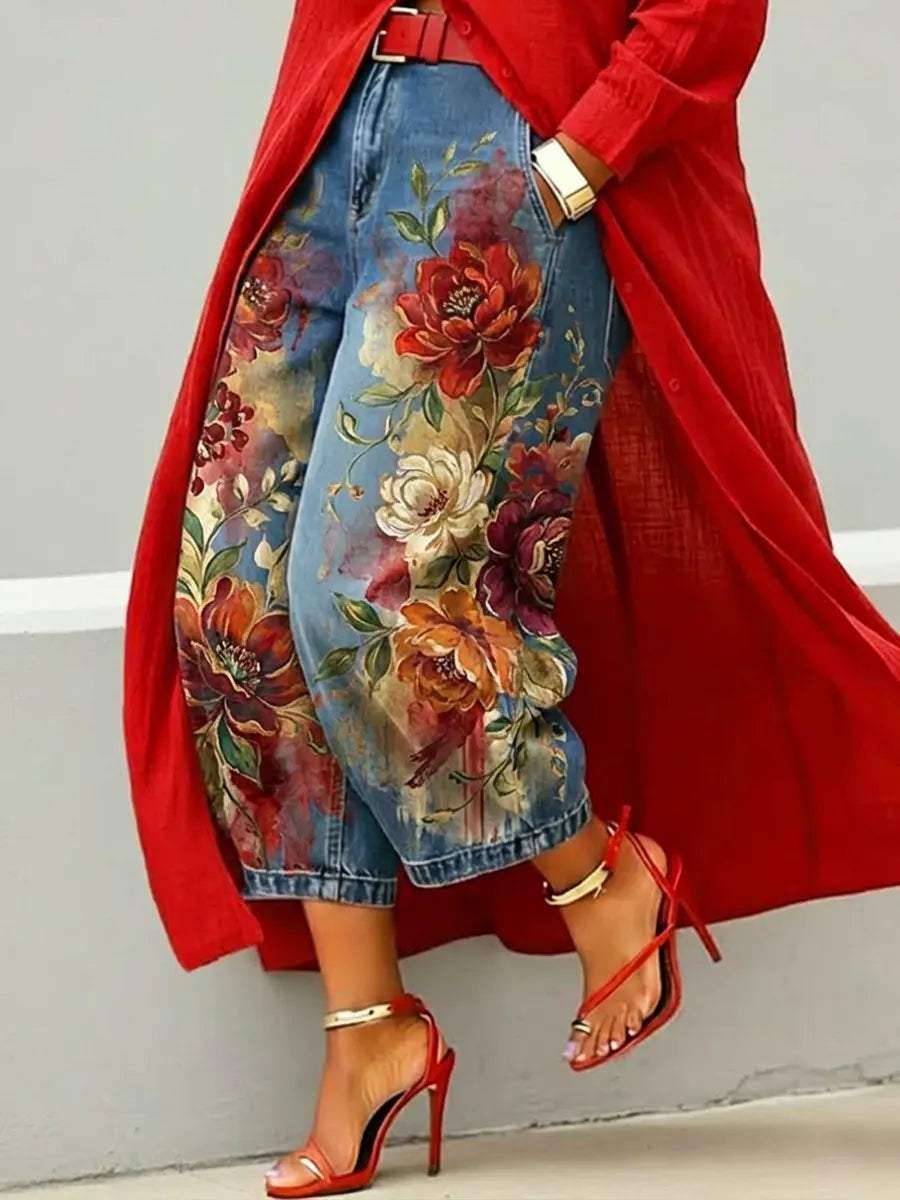 Women's Retro Floral Pattern Art Print Casual Jeans – lolonb