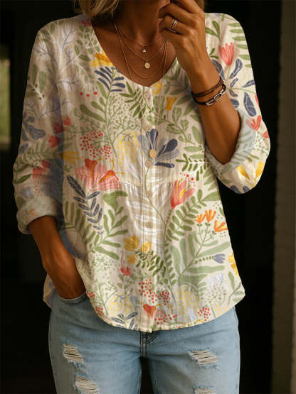 Women's Retro Flower Art Print Linen Cotton Shirt