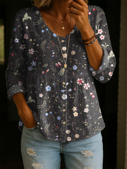 Women's Retro Flower Art Print Linen Cotton Shirt