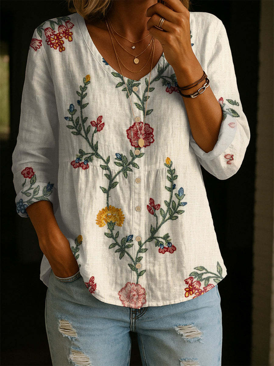 Women's Retro Flower Art Print Linen Cotton Shirt
