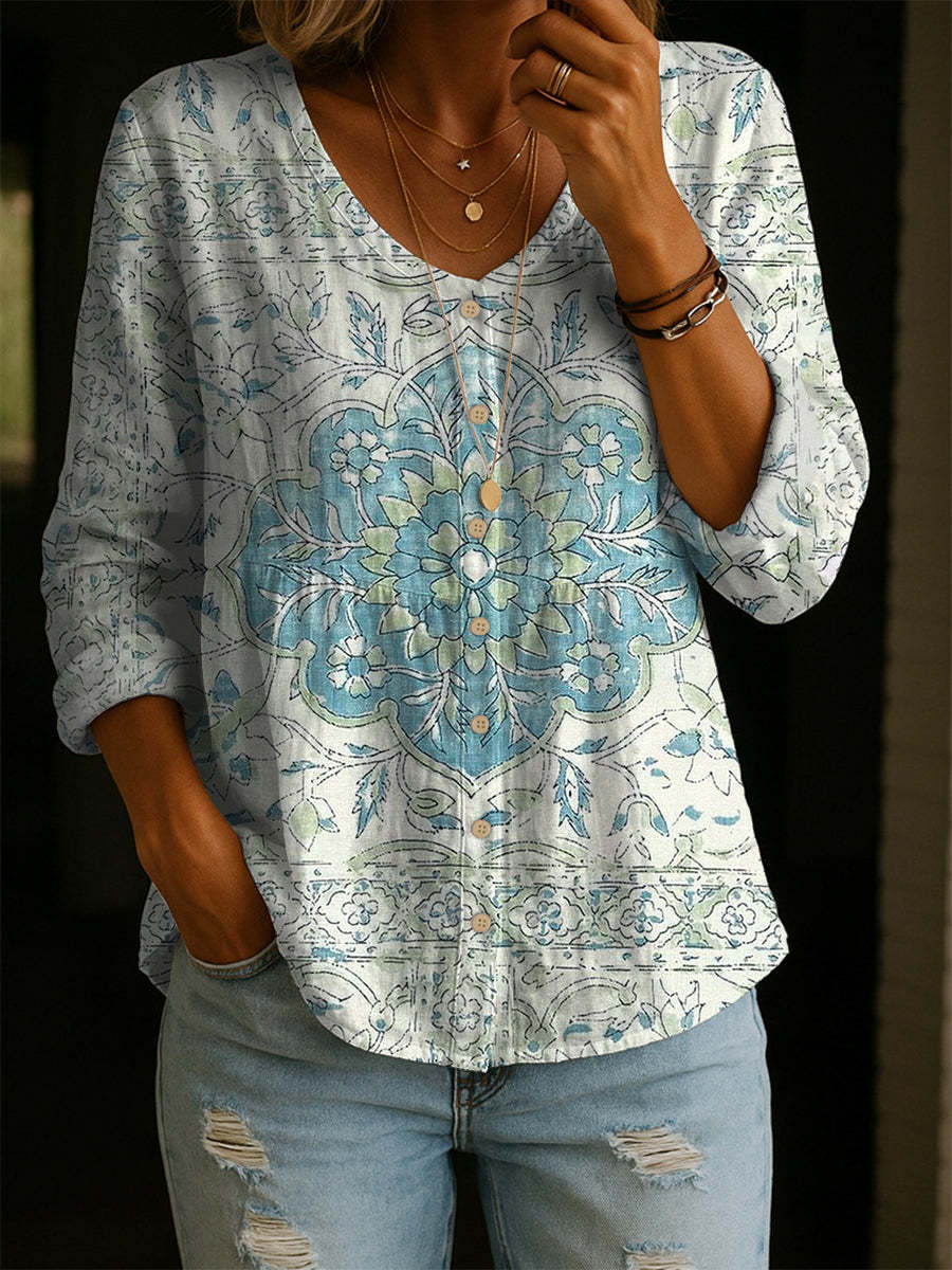 Women's Retro Flower Art Print Linen Cotton Shirt