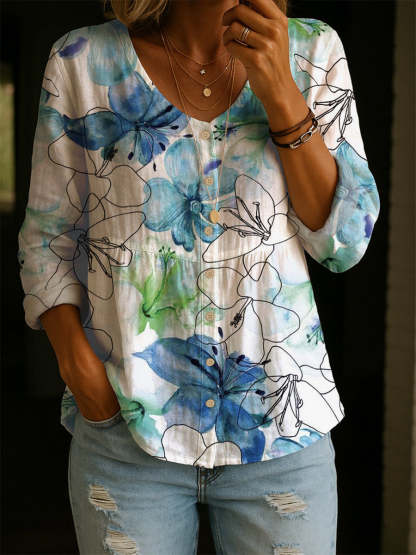 Women's Retro Flower Art Print Linen Cotton Shirt