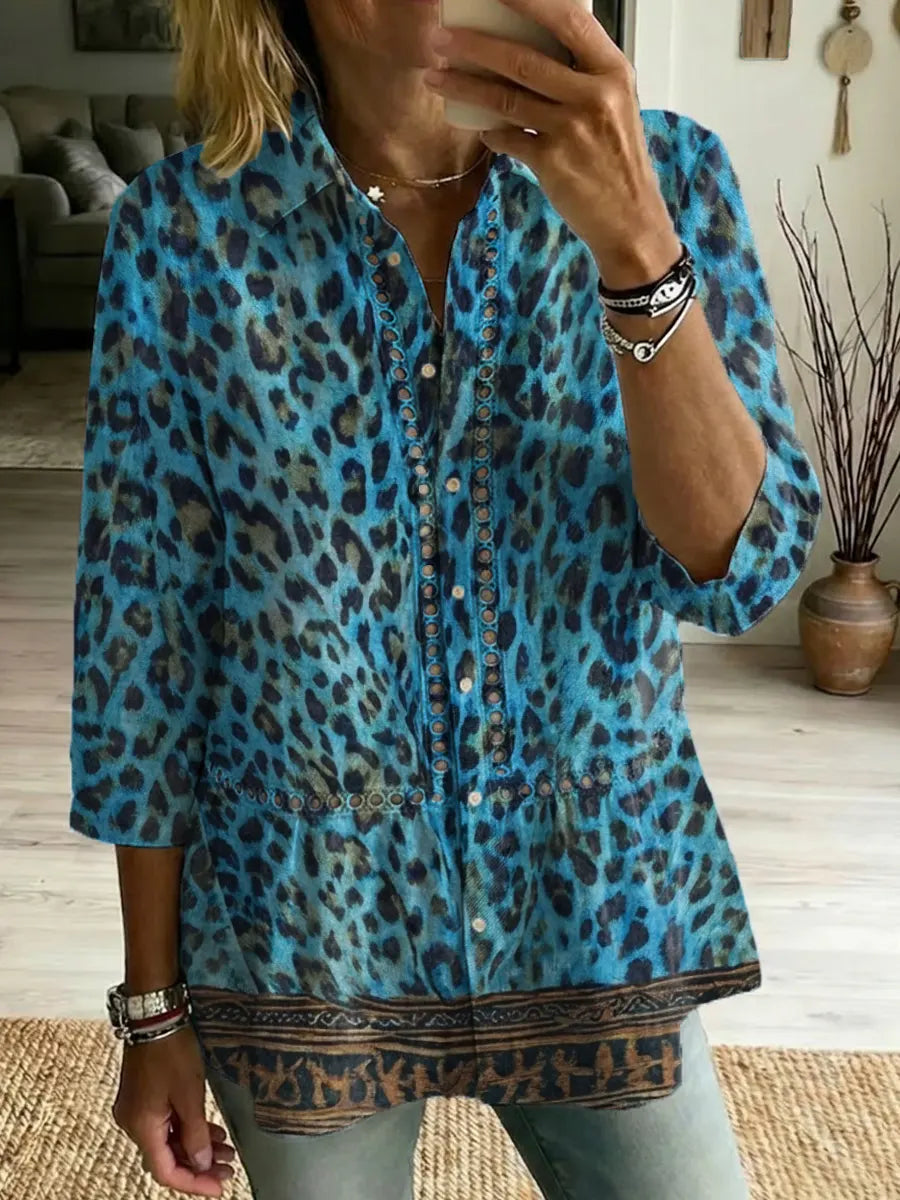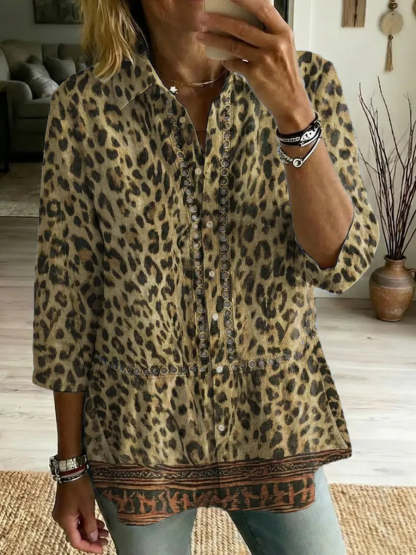 Women's Retro Leopard Art Print Casual Lapel Cotton Shirt
