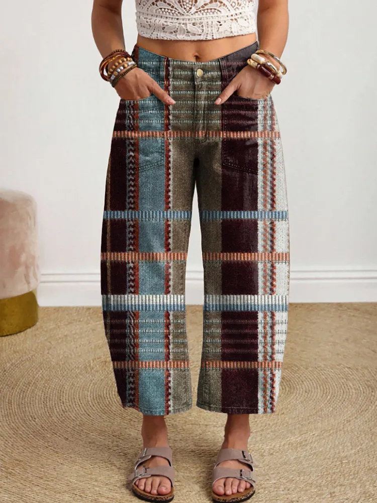 Women's Retro Plaid Art Print Casual Washed Cotton Jeans