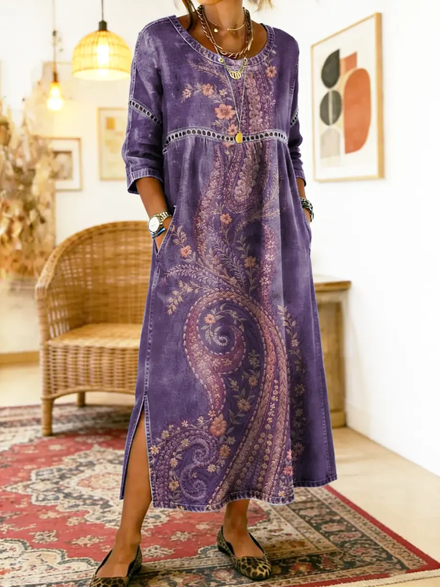 Women's Retro Purple Ethnic Paisley Flowers Art Print Cotton Denim Dress With Lace Trim