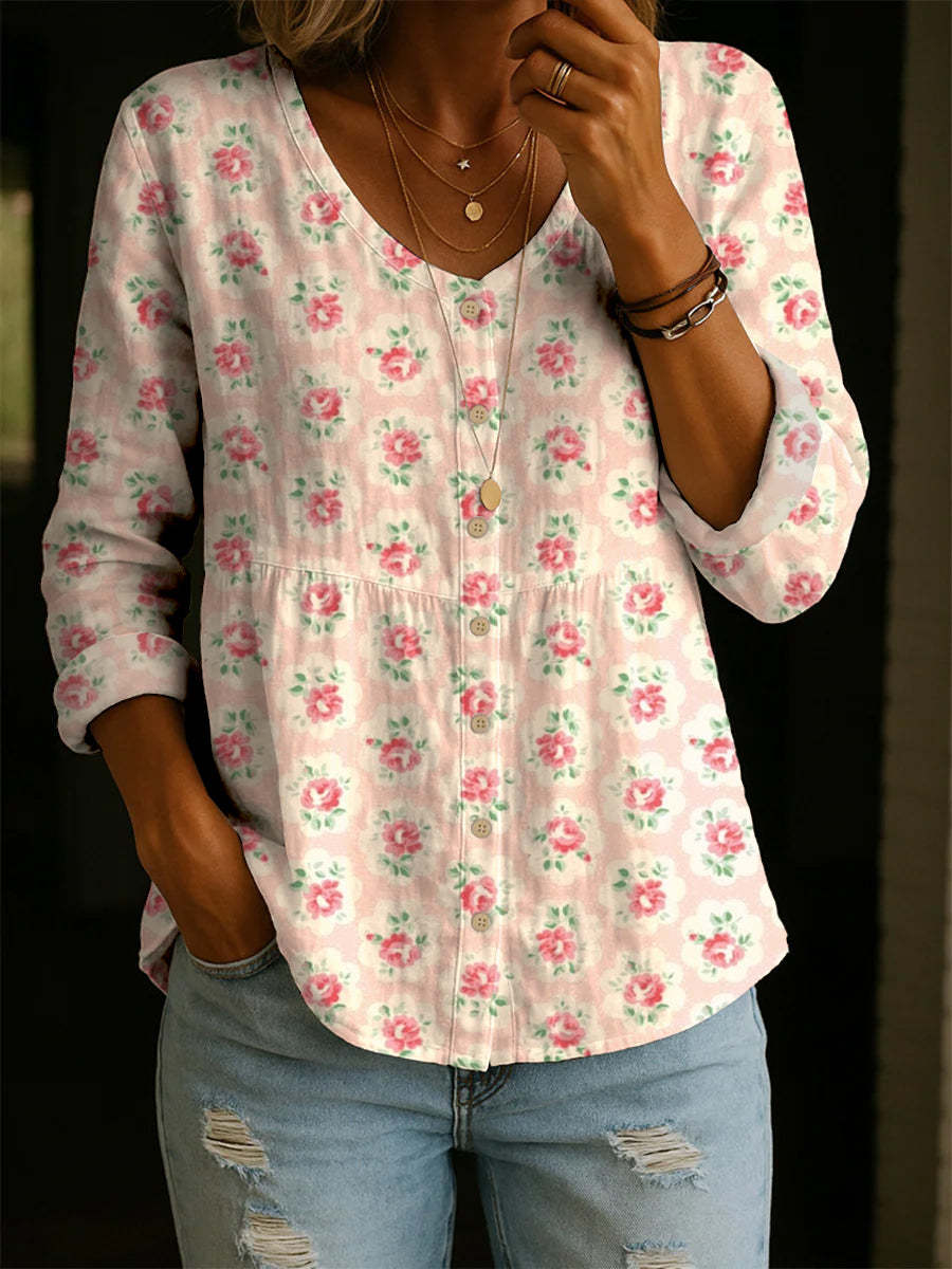 Women's Retro Small Flower Print Casual Cotton Shirt