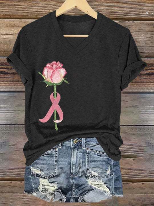 Women's Rose With Pink Ribbon Embroidered V Neck T-Shirt