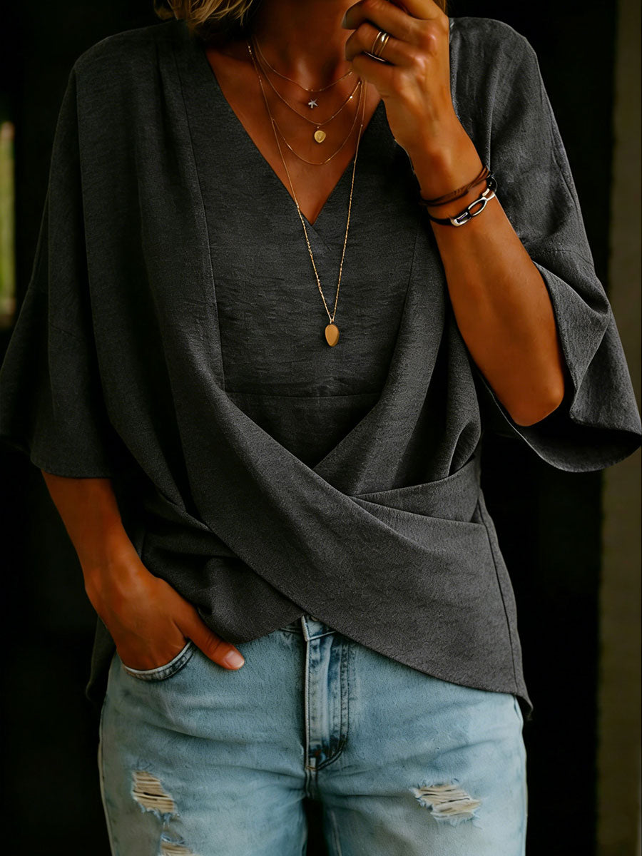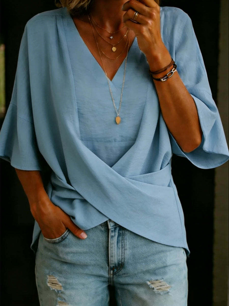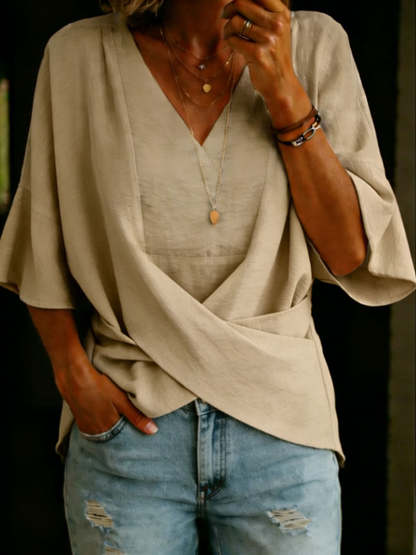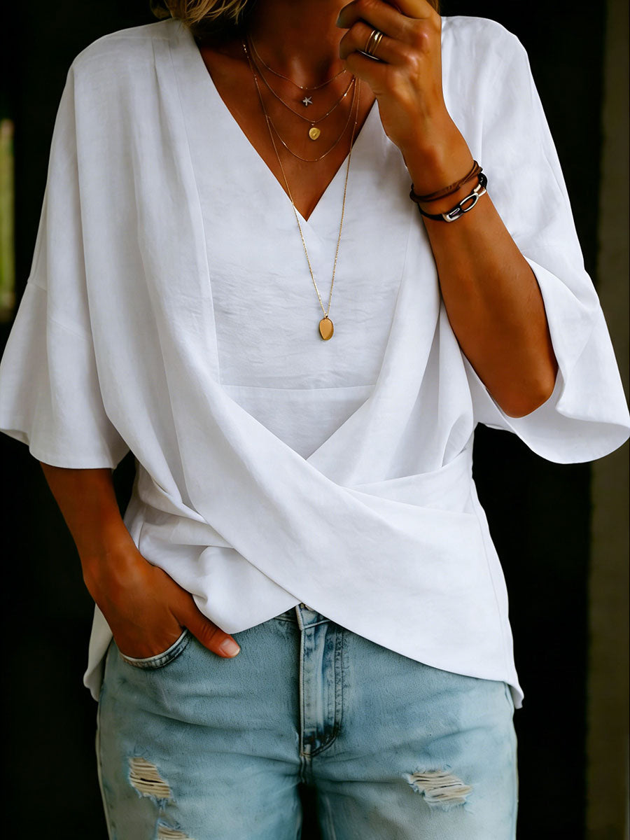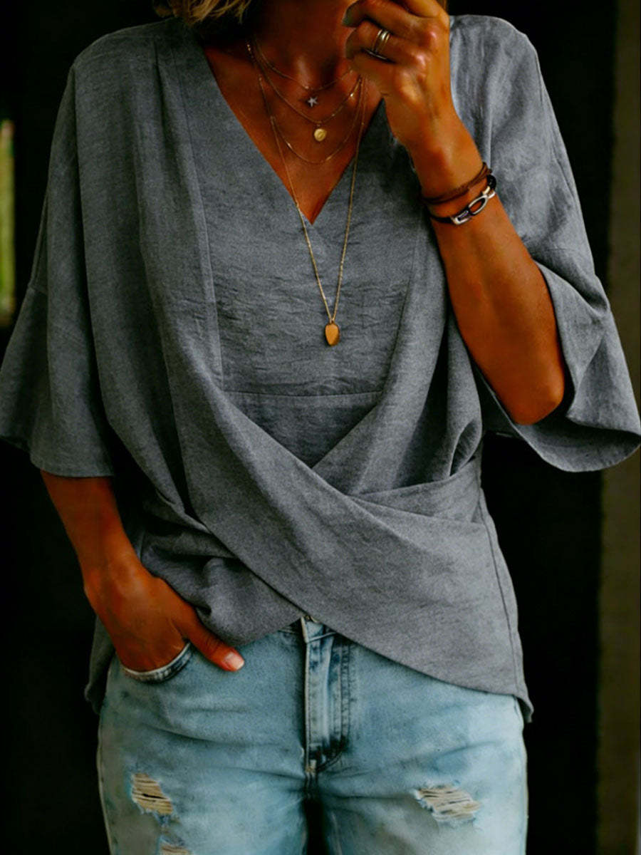 Women's Solid Color V-neck Crossover Hem Linen Cotton Shirt