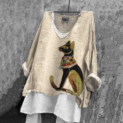 Women's Vintage Ancient Egyptian Cat Embroidered Linen Flowy Shirt
