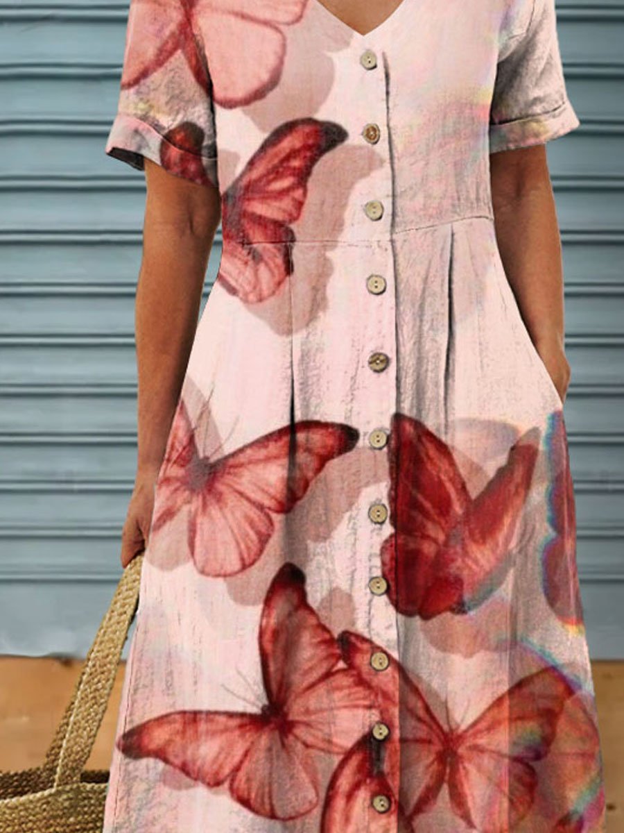 Women's Vintage Elegant Butterflies Art Pattern Print Casual Linen Pocket Tunic Dress – lolonb