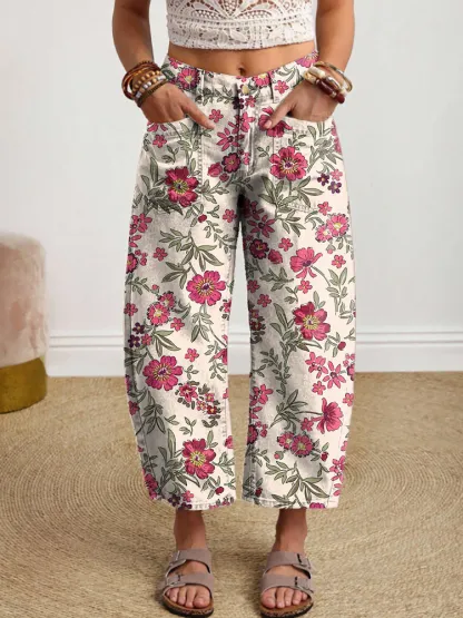 Women's Vintage Ethnic Cute Floral Art Print Leisure Pocket Jeans