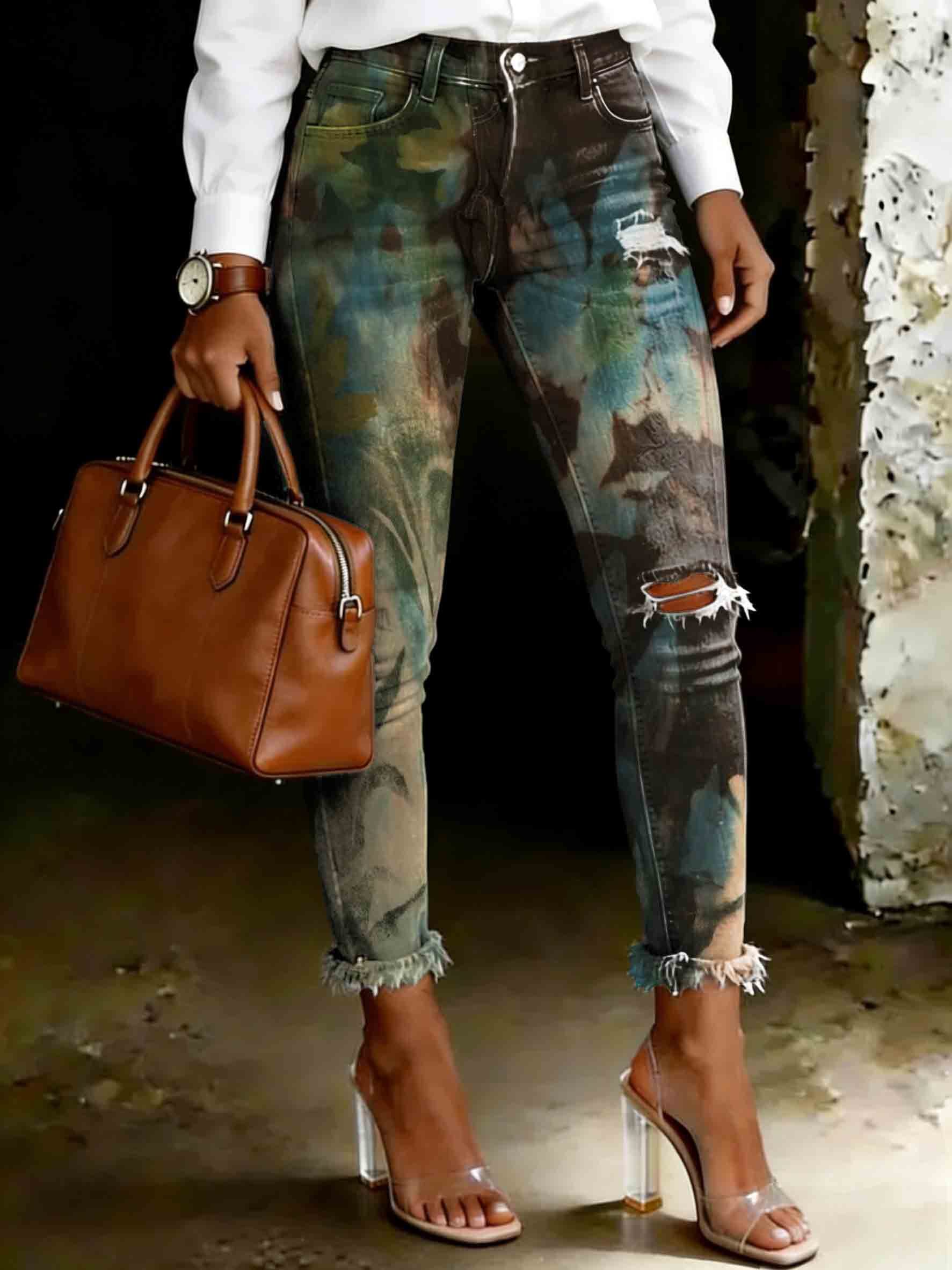 Women's Vintage Floral Art Print Ripped Skinny Jeans