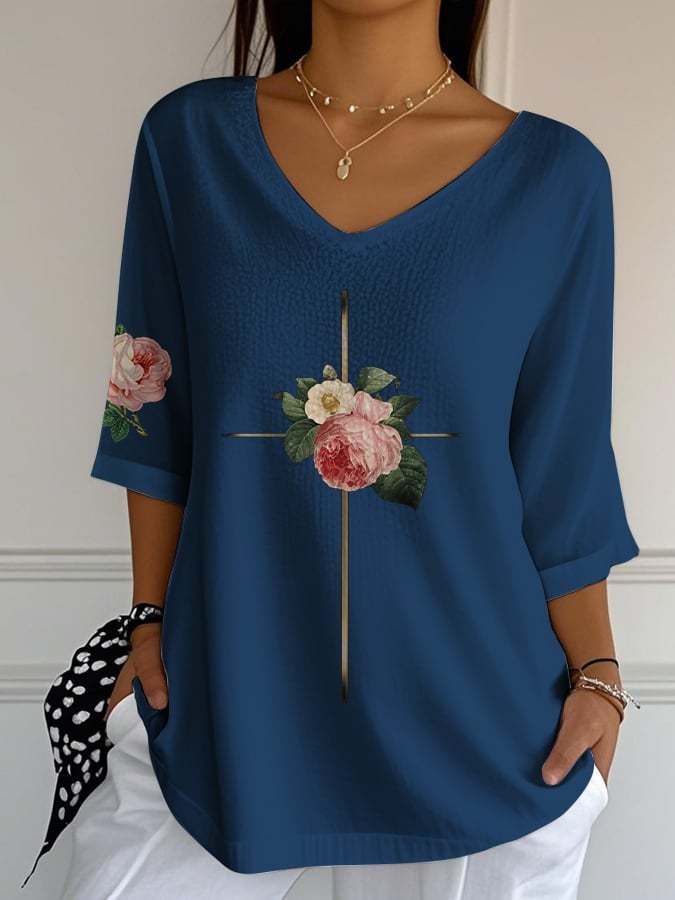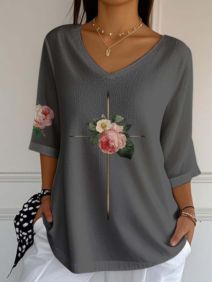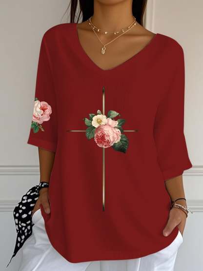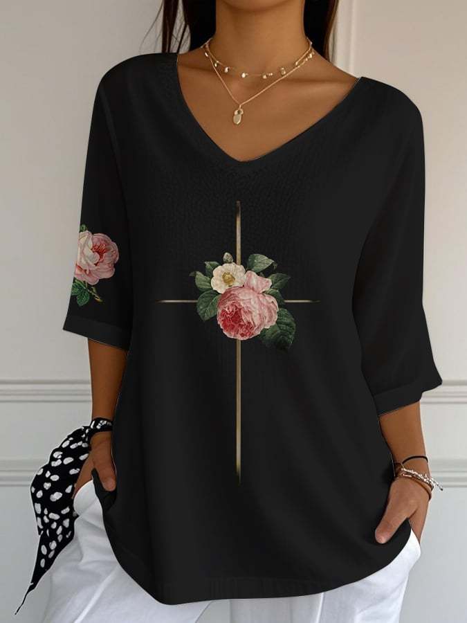 Women's Vintage Floral Metal Cross V-Neck T-Shirt