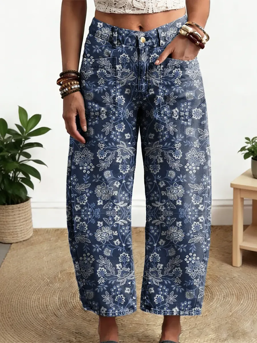 Women's Vintage Floral Pattern Art Print Casual Cotton Denim Pants